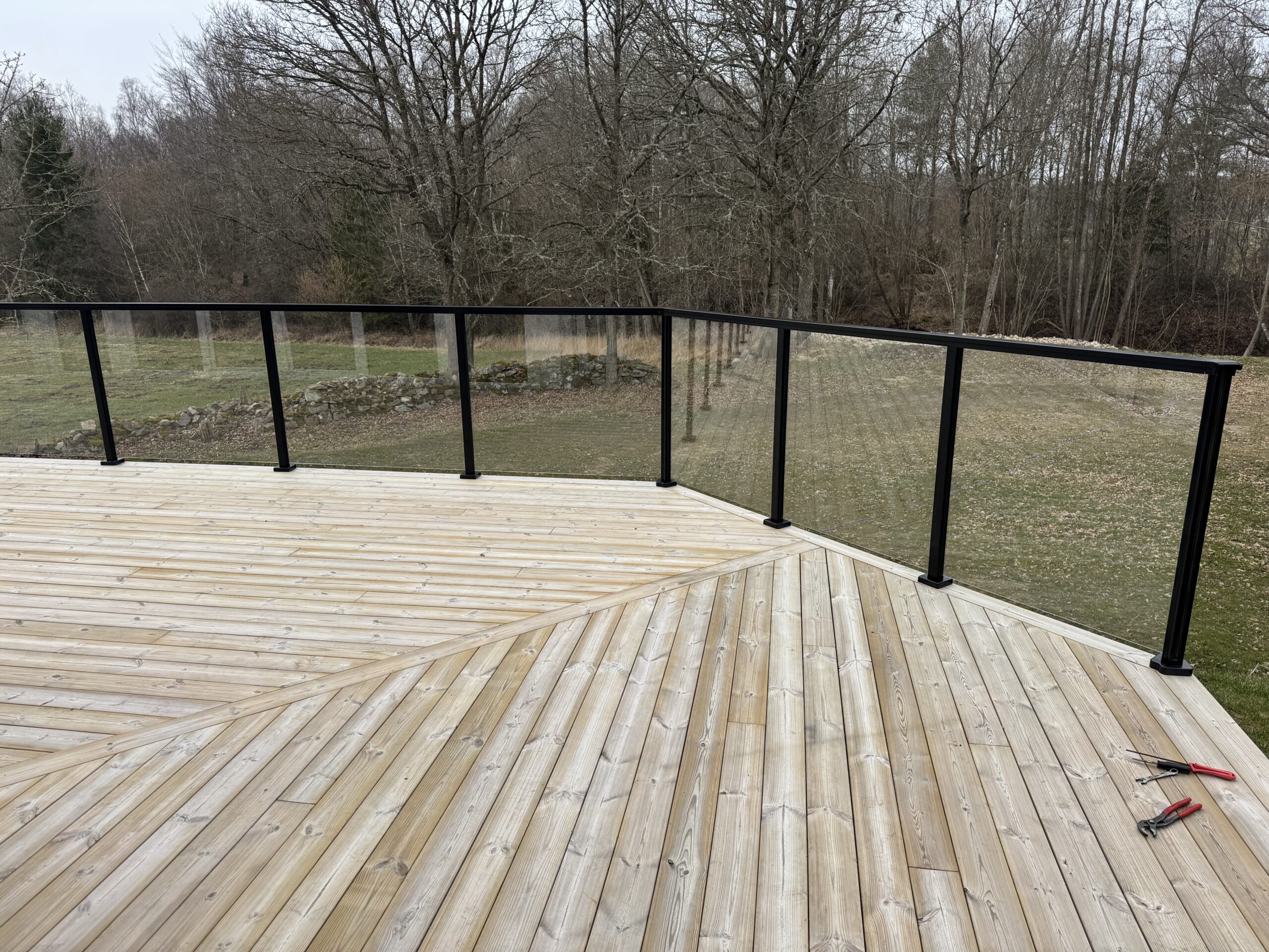 Vid nedfallrisk är över två meter rekommenderas lamellglas 8,76 mm. Under två meter rekommenderas härdat glas 8 mm.