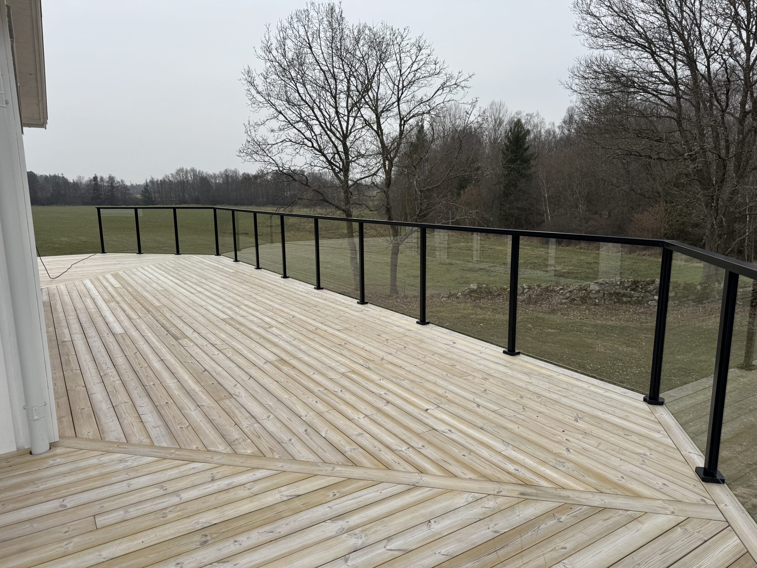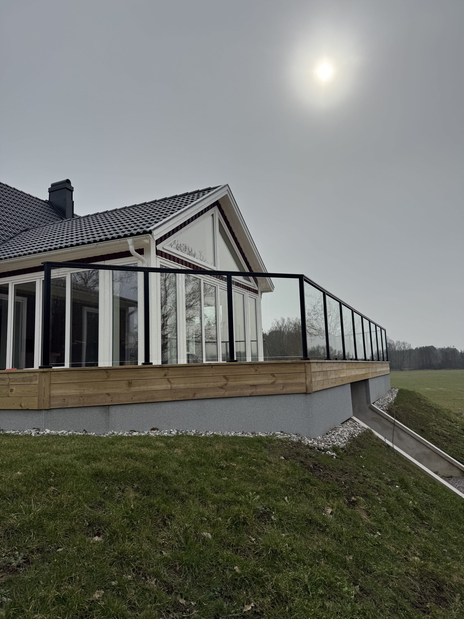 Ett glasräcke med aluminiumstolpar består av stolpar med eller utan överliggare och glas som rekommenderas för fallhöjden utanför räcket.