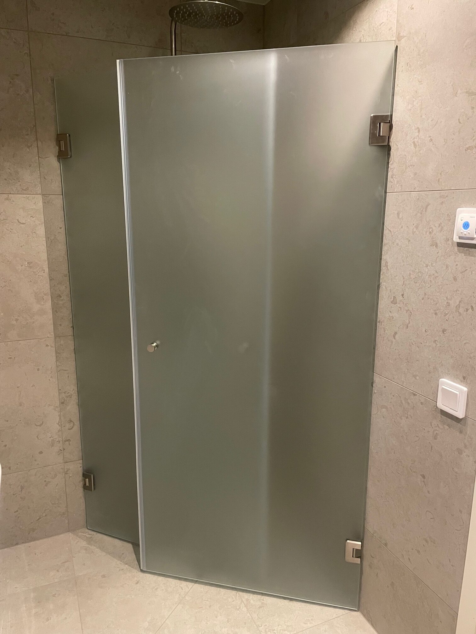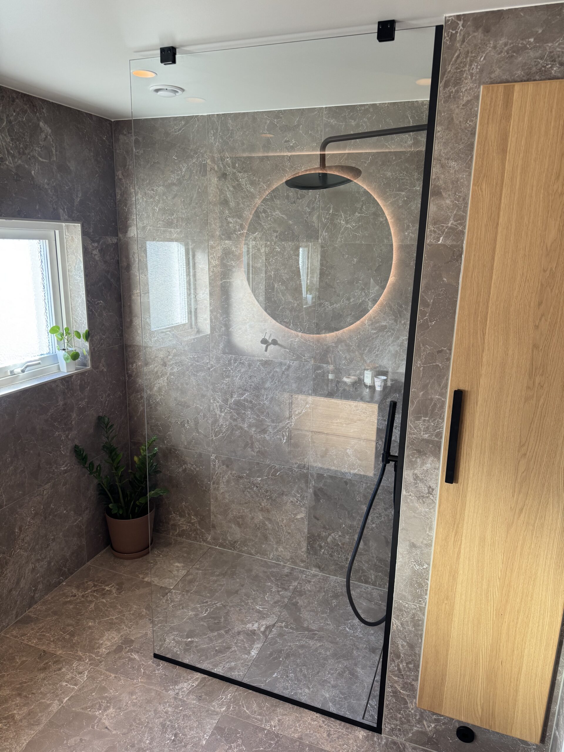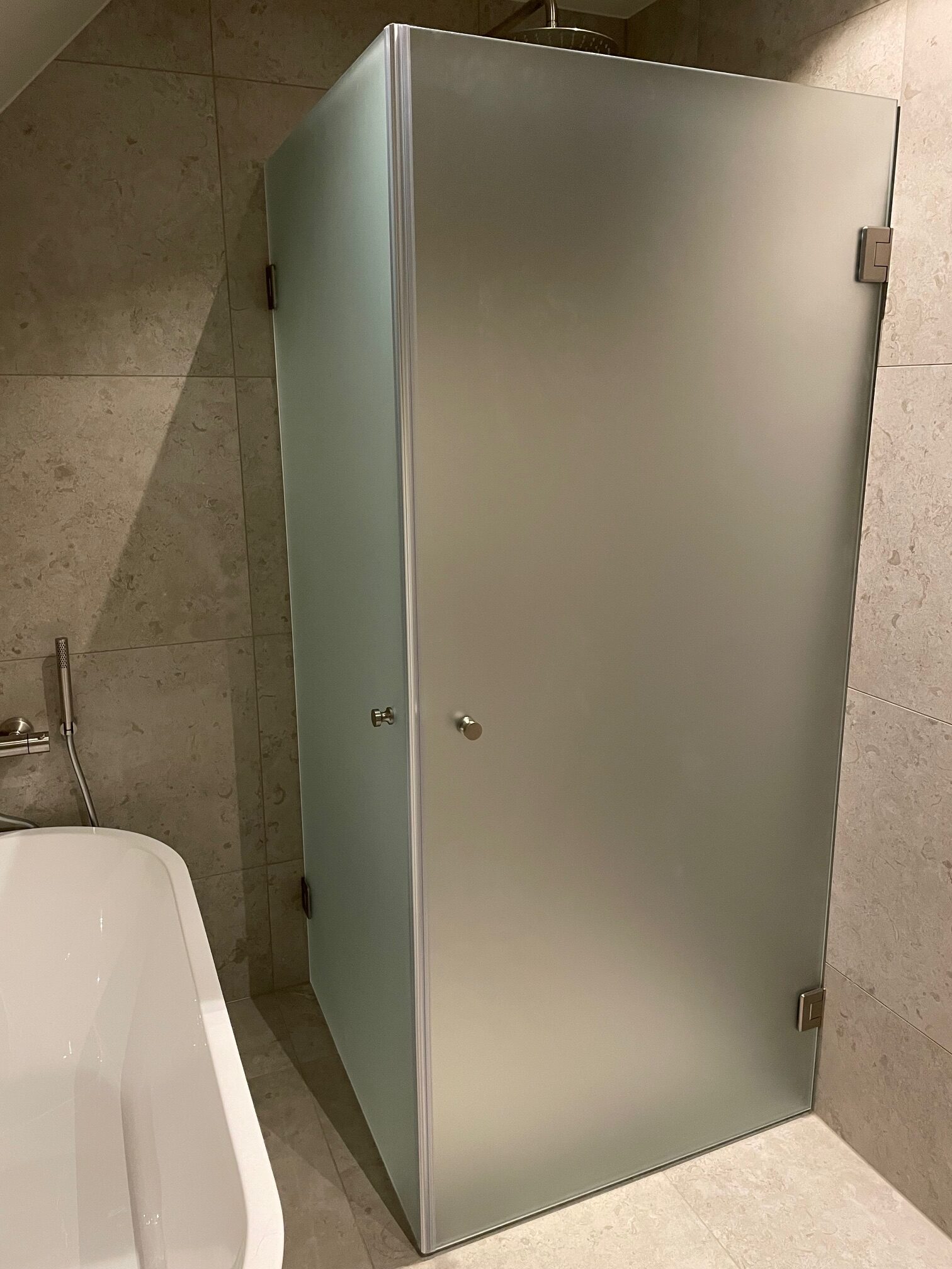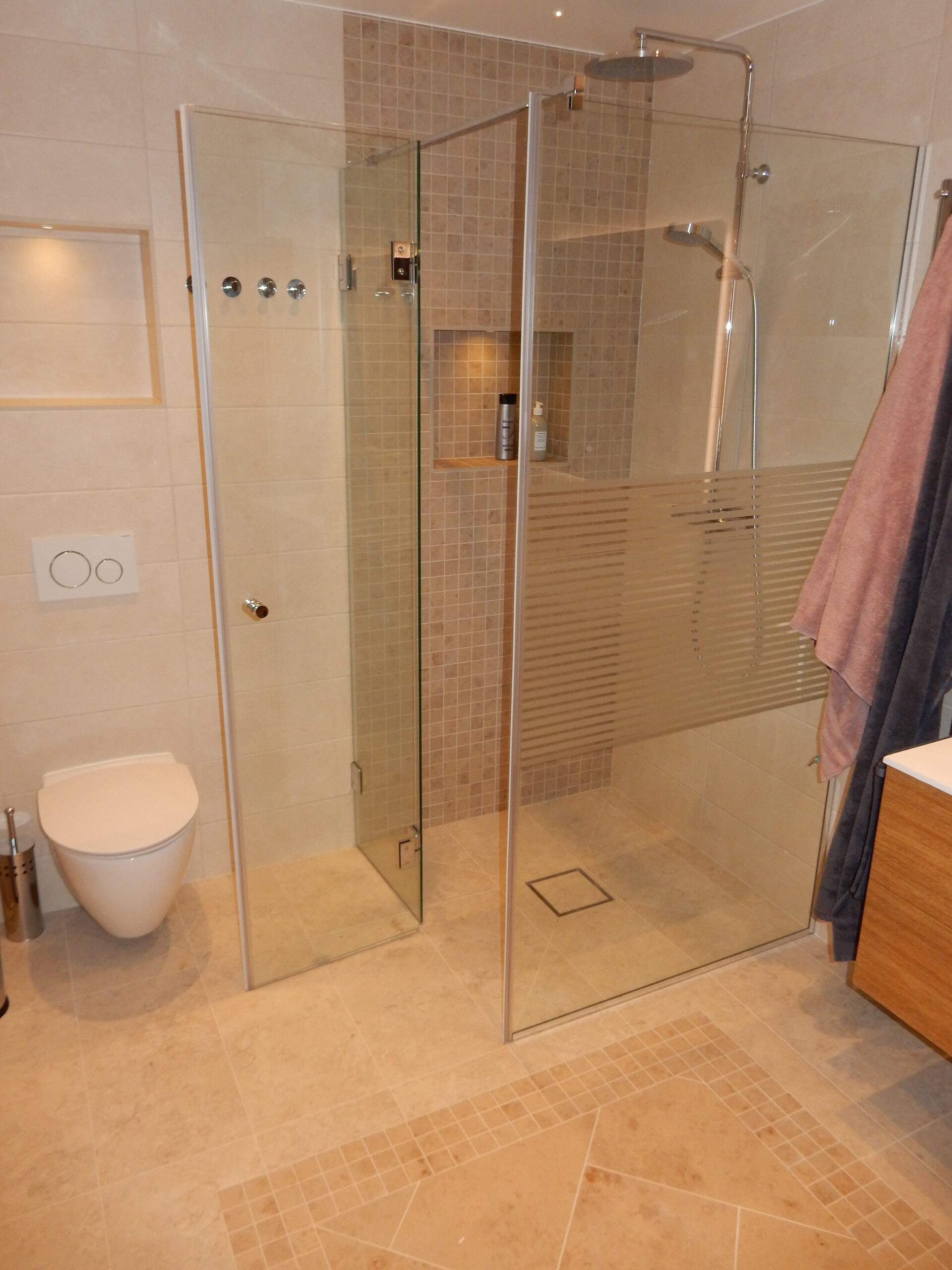 På bilden till höger är det duschvägg med dörr i härdat 8 mm klart glas.